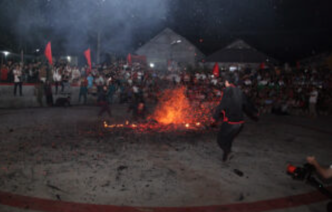 Du khách trải nghiệm lễ nhảy lửa của đồng bào ở Tân Trịnh. Ảnh: TITC